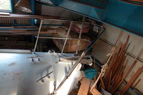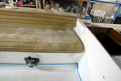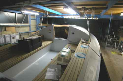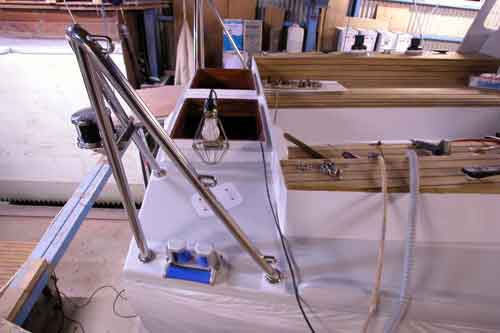 コクピットのチーク張りが終わり 左舷コクピットベンチに乗っているのは燃料タンク 外洋を走る船は燃料タンクはなるべく軽い方がよい ハードドジャーが取り付くところに仮止めしたのはブームギャロー |