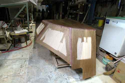 デッキ部品取り付け部分をマスキングしておいて 台風のためにストップしていた接着や いよいよ木工部分は少なくなってきた |