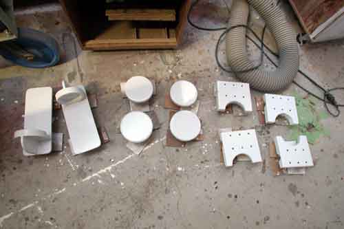 右からブームギャローに取り付けるブーム受け 真ん中はチークのウインチ取り付けベース 左は消火器取り付け台 ハードドジャーを紫外線よけのために白く塗るのに合わせて |