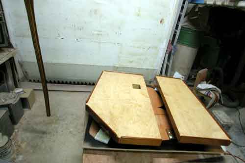 ハードドジャーの外側角ステッチ銅線を切り 何も固定しないとブヨブヨで頼りないが メインテーブルの脚となる部分も同時進行で作っている |