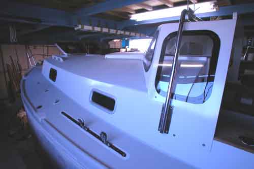 バウハッチとグラブレール前左右を取り付ける マストを支えるワイヤーを固定するチェーンプレートも取り付ける ドッグハウス右舷後方の窓も取り付け みんな一人では出来ないので連れ合いに手伝ってもらう 写真で解るようにドッグハウスの角や 市販の船はそんな大切な所のノンスリップ加工をしていない |