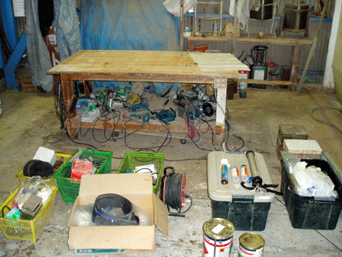 右手前は4サイクル2馬力エンジンから取り外したキャブレターを灯油に浸けたもの