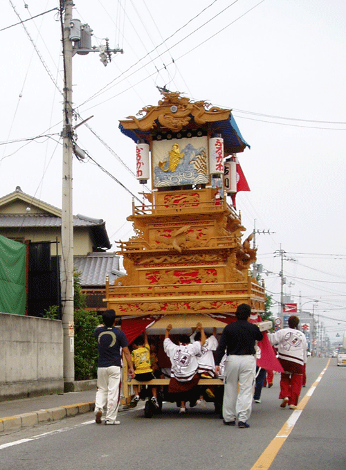 西条まで来たら秋祭りのだんじりが台車に乗って道を進んでいるのに出くわした
