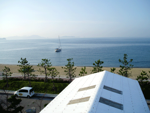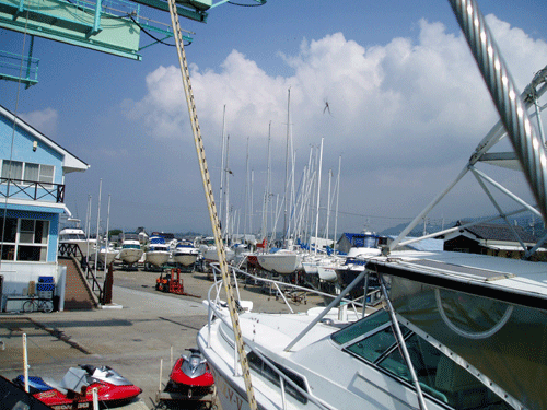 写真中央送電鉄塔の所に見えているのがヨット群のマスト