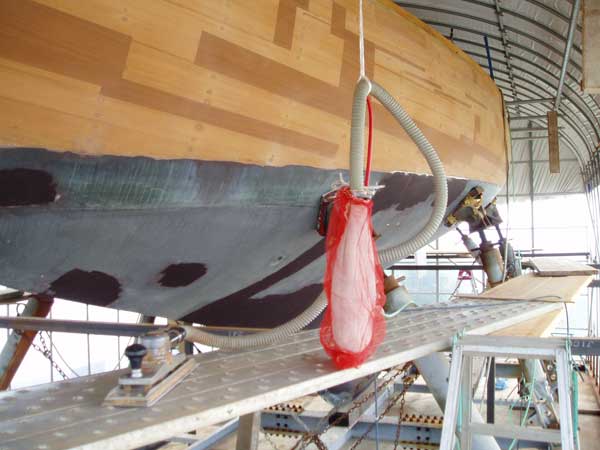 左舷船首から80#サンドペーパーのボードサンディング