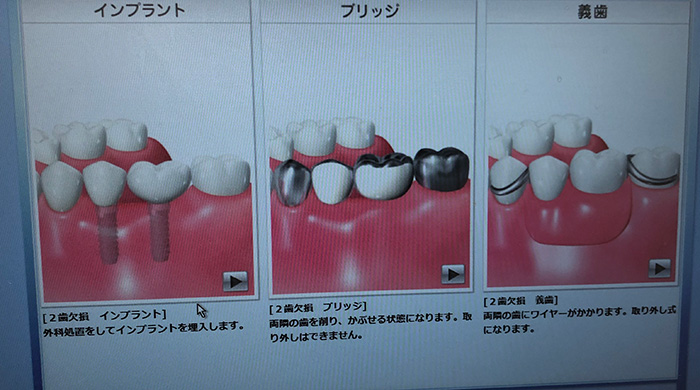 その時説明してくれた3種類インプラント・ブリッジ・義歯の説明写真です
