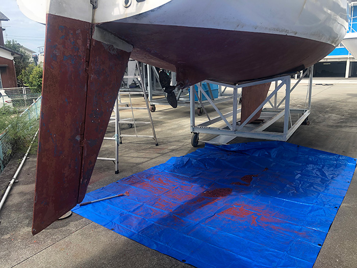 ブルーシートを敷いてスクレーパーで船底塗料を剥がしにかかる