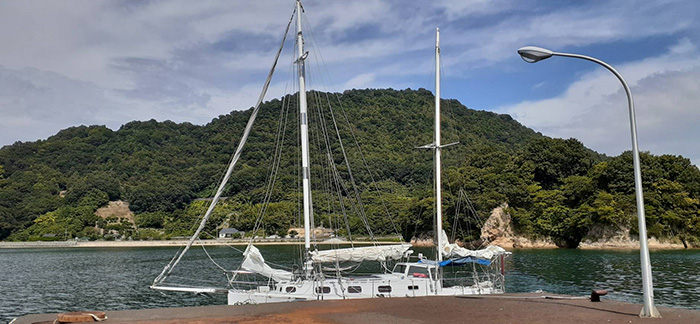 昔から留めている錆びた桟橋の所定の位置に出船で停泊