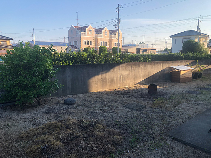 庭の草を綺麗にして返そうと草削り鍬で草を削っています