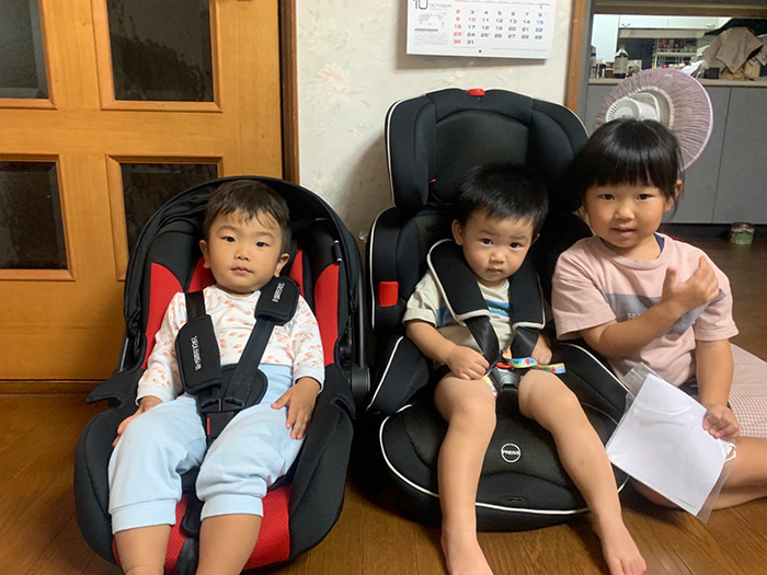 なぜか男の子二人は車のチャイルドシートベルトに縛り付けられています