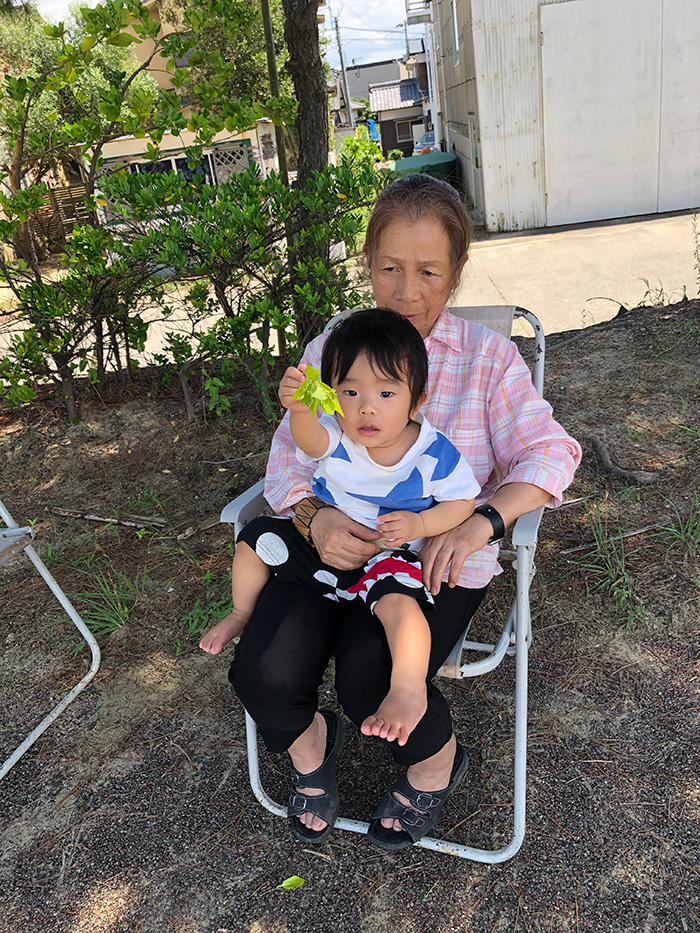 一歳の次男未奈人君は泣きもしないで和江さんに抱かれて海に来た
