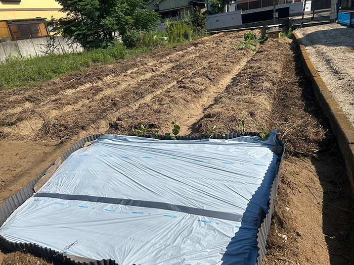 上には暑さを嫌う山芋を守る白黒マルチをかけた