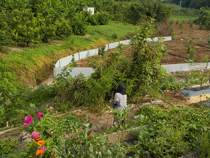 先ずは一番遠くのこはる農園にいき今だとナスの水やりや畝間の草取り