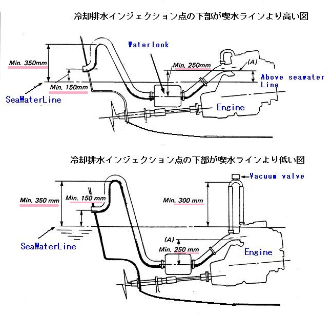 これは実によく考えられたもので 冷却水混じりの排気をウォーターロック空間から排出するのは エンジンから来た排気パイプとは別にウォーターロックと言う密閉された容器の底から別の排気パイプを立ち上げ、