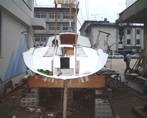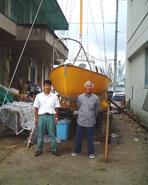 昨日は自作艇のマスト立てを手伝いました。宇和島水産高校の先生で井上洋さんという人が2年半ががりで高校の校庭にビニールハウスの小屋を造り、その中で6メートルツーリングセーラーマーク3を完成させました。日本全国的に見ると西高東低のヨット自作(関東よりも関西の方が自作が盛ん)ですが、愛媛県で言うと中予つまり松山市近辺や東予つまり東予市近辺は自作が振るわず、南予の宇和島市近辺は昔からヨットの自作王国でした。30フィートクラスのクルーザーまで自作していて、今でも宇和海に浮いています。ここ20年ほどは、自作仲間もそのまま年をとり若い人が自作しないので、クルーザーは降りてなかったようですが、ここに来てクルーザーが20年ぶりに進水するので、昔の自作少年達が(今やおじさん以上)よってたかって協力という感じで、最後の部品やセールや船外機等お金の沢山必要な部分で井上さんは大分協力してもらったそうです。素晴らしい出来具合で、早速11月には保内町のレースにでるそうです。レース荒らしと言われる6メートルツーリングセーラーが、どんな走りをするのか楽しみです。