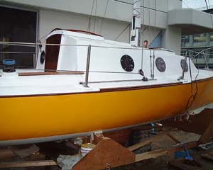 図面にはないサーフィングボードを付け、その上にエンジンブラケットを作っています。ラダーもアウトボードラダーから、インボードラダーに変更していました。後ろから見た感じはまるでディンギーのお化けです。 |